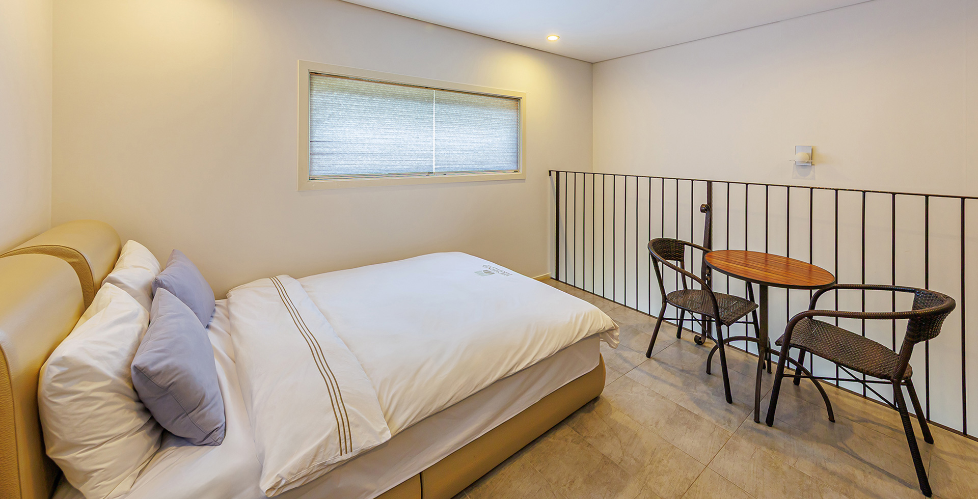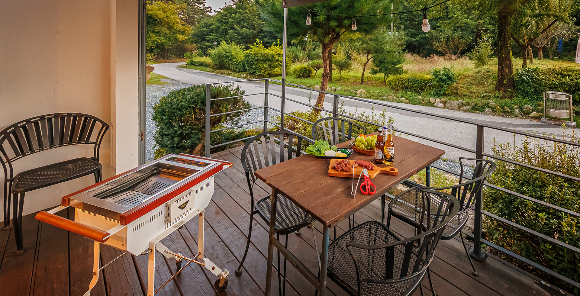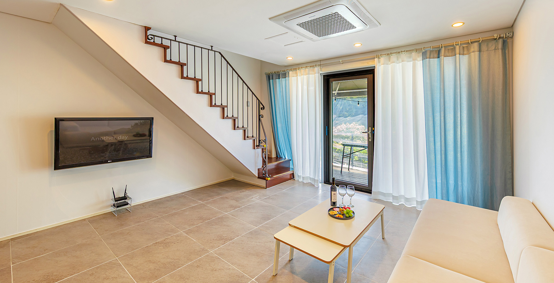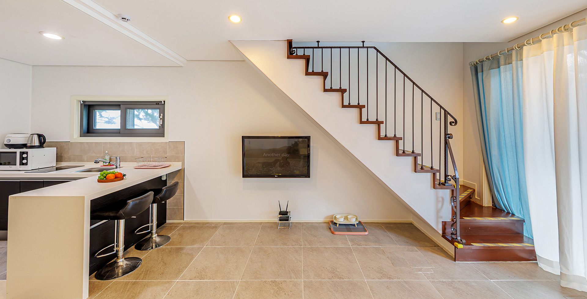 - 복층형/침대A(2층) + 거실 겸 주방 + 화장실1 + 개별수영장 + 테라스바베큐 + 복층