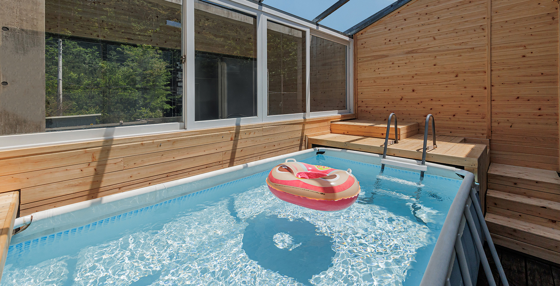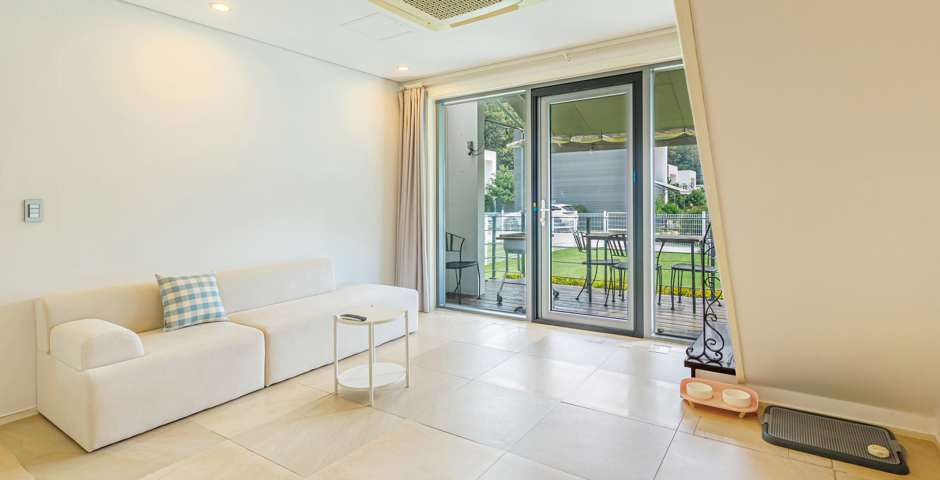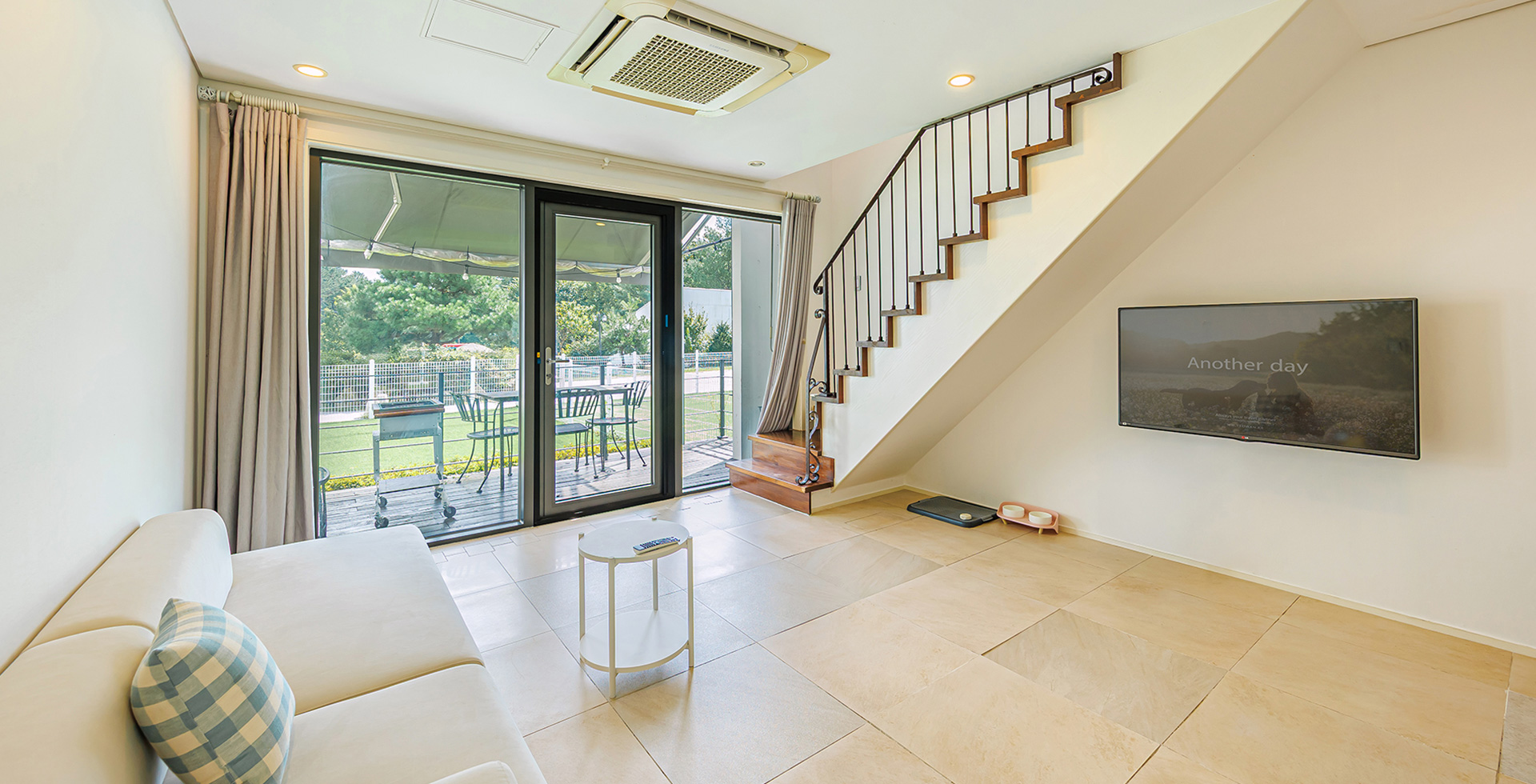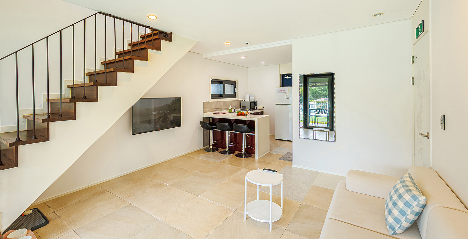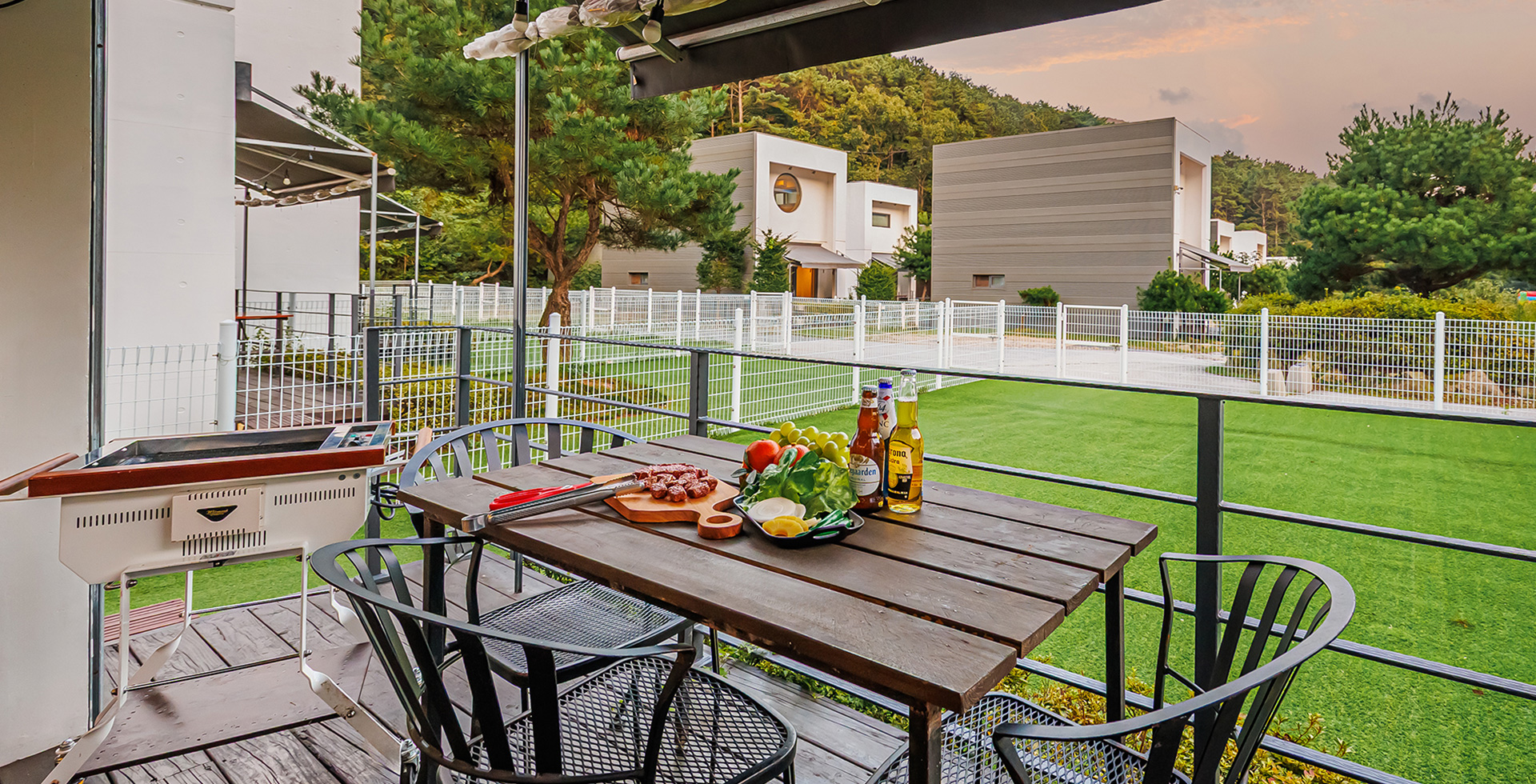 - 복층형/침대A(2층) + 거실 겸 주방 + 화장실1 + 개별수영장 + 테라스바베큐 + 개별펜스